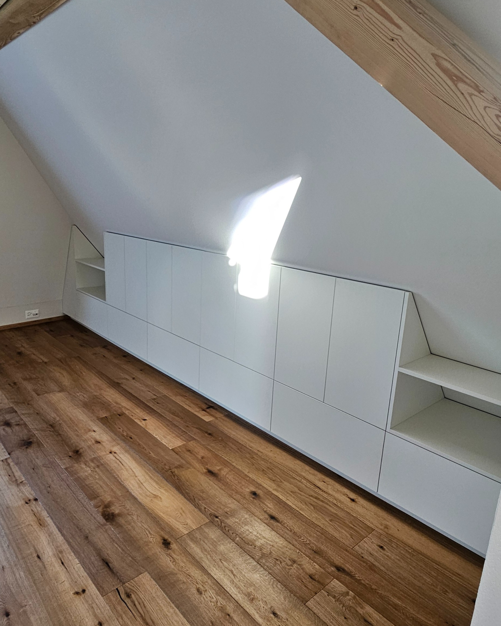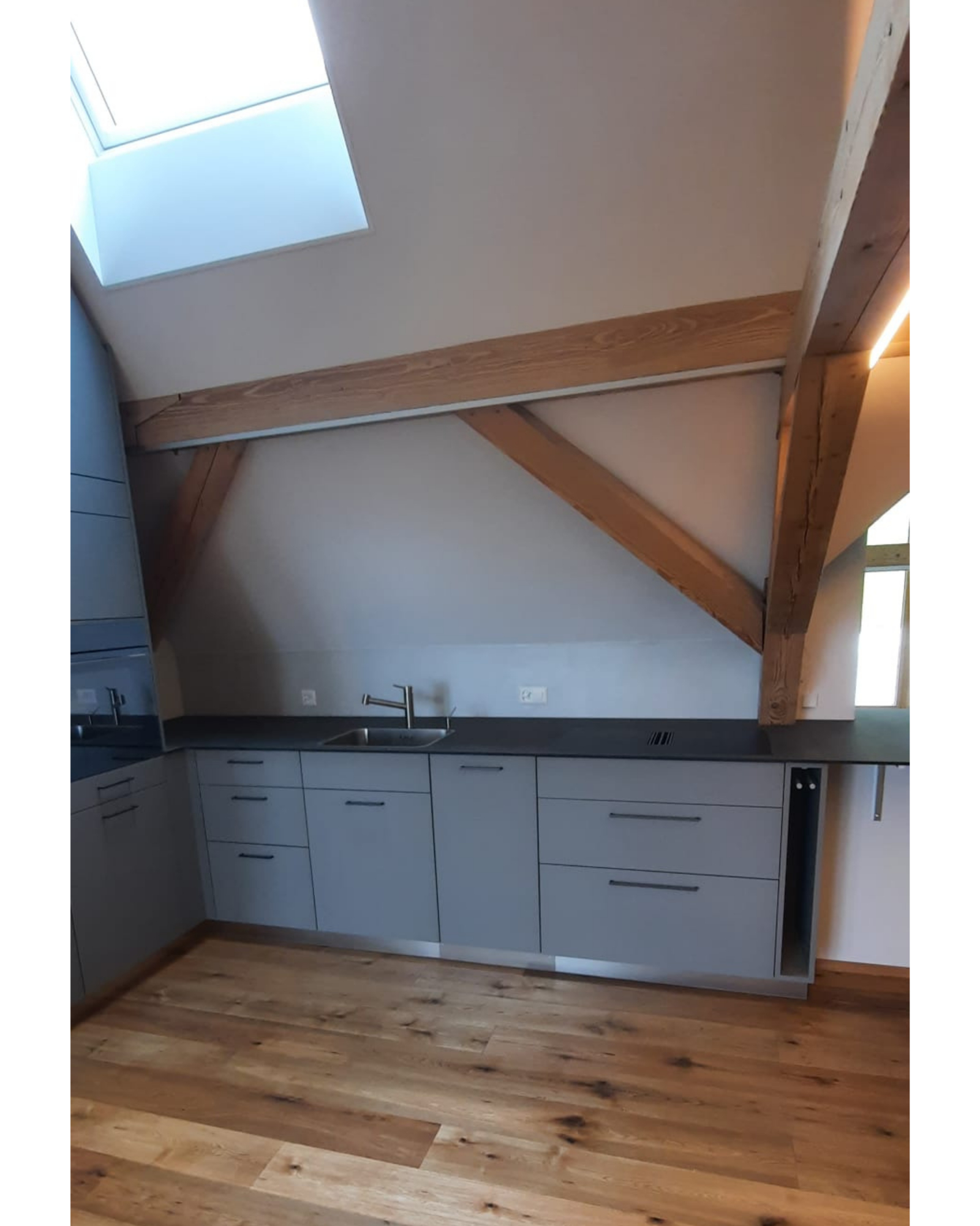 Hast du schon einmal eine Küche gesehen, die raumhoch in eine Dachschräge von 5 Metern integriert wurde? 🤔 Unsere neuesten abgeschlossenen Arbeiten für unsere Kundschaft zeigen, wie man jeden Platz perfekt ausnützt! Die tiefe Arbeitsfläche aus Kunstharz Vollkern bietet nicht nur Stabilität, sondern auch Stil. Und schau dir diesen Schrank in der Kniewand an – mit offenen Nischen für das gewisse Extra! 👌